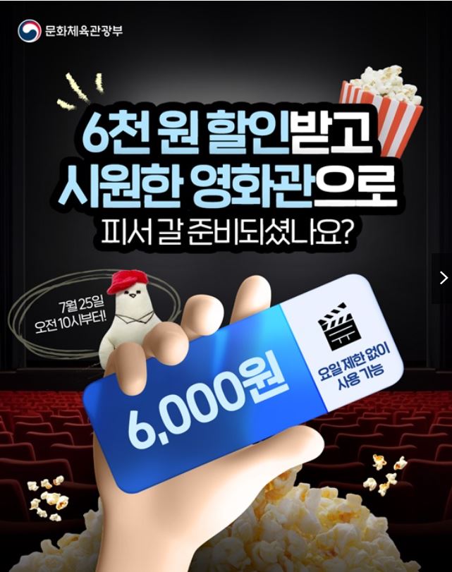 무더운 여름, 집에만 있기보다 시원한 영화관에서 재미있는 영화 한 편 감상하는 건 어떨까요? 문체부 영화 할인으로 6000원을 절약하며, 문화생활을 보다 풍성하게 즐길 수 있는 절호의 기회입니다.