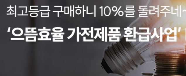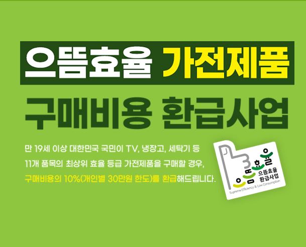 만 19세 이상 대한민국 국민이 TV, 냉장고, 세탁기 등 11개 품목의 최상위 효율 등급 가전제품을 구매할 경우, 구매비용의 10%(개인별 30만원 한도)를 환급해드립니다.